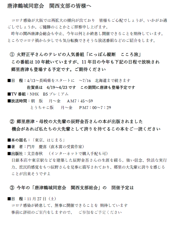 唐津鶴城同窓会 関西支部ニュース (2021年4月)